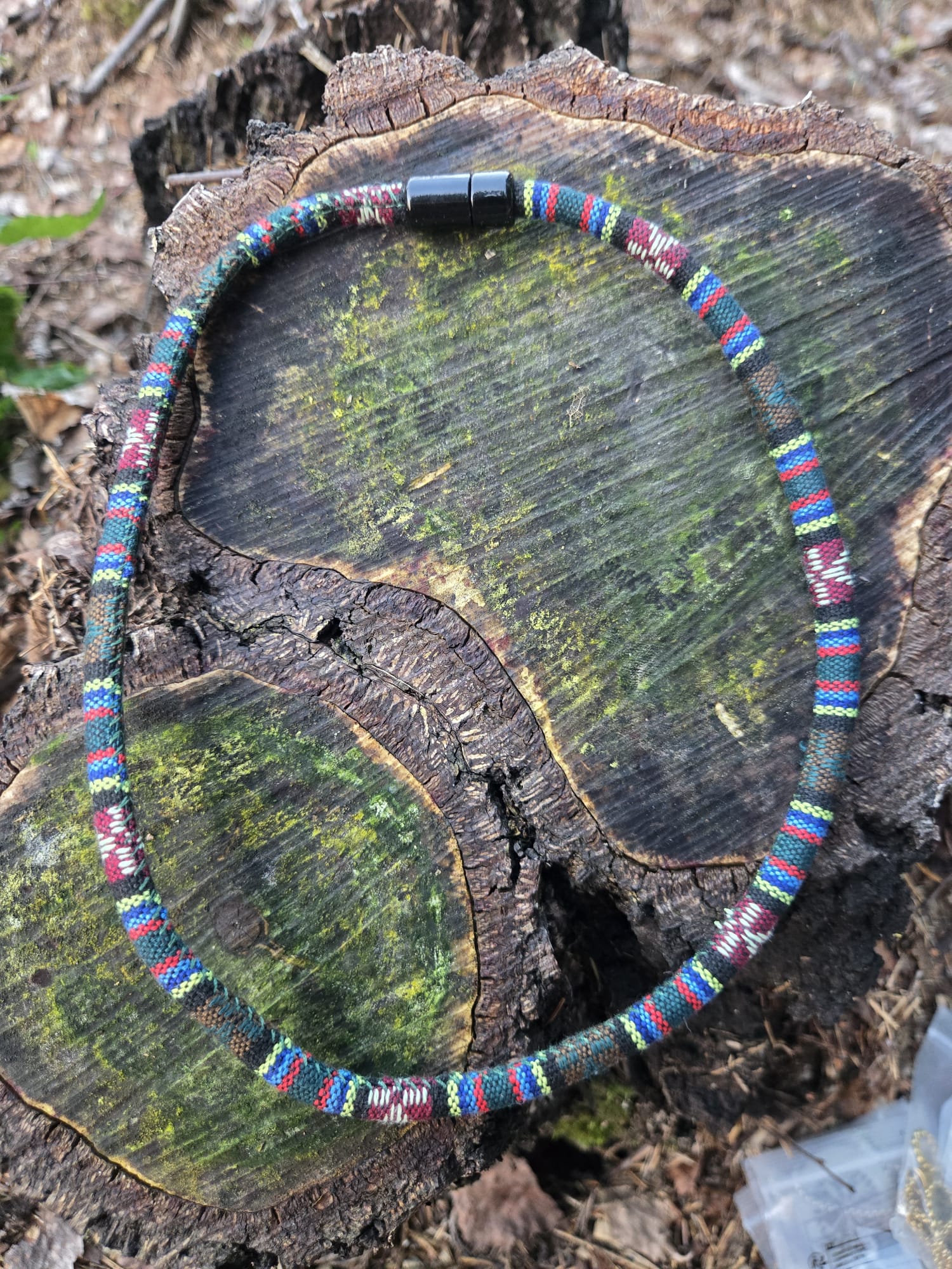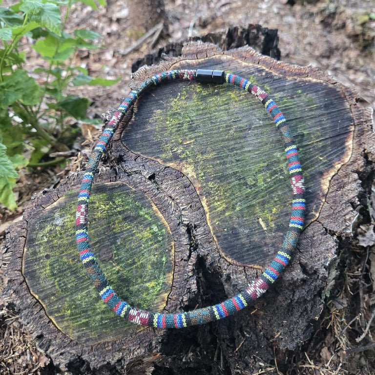 Dette fargerike halskjedet er laget av sterke og myke bomullstråder, flettet i et iøynefallende etnisk mønster med fine detaljer. Halskjedet har en praktisk lås i solid plast, og passer perfekt både til hverdags og til spesielle anledninger.