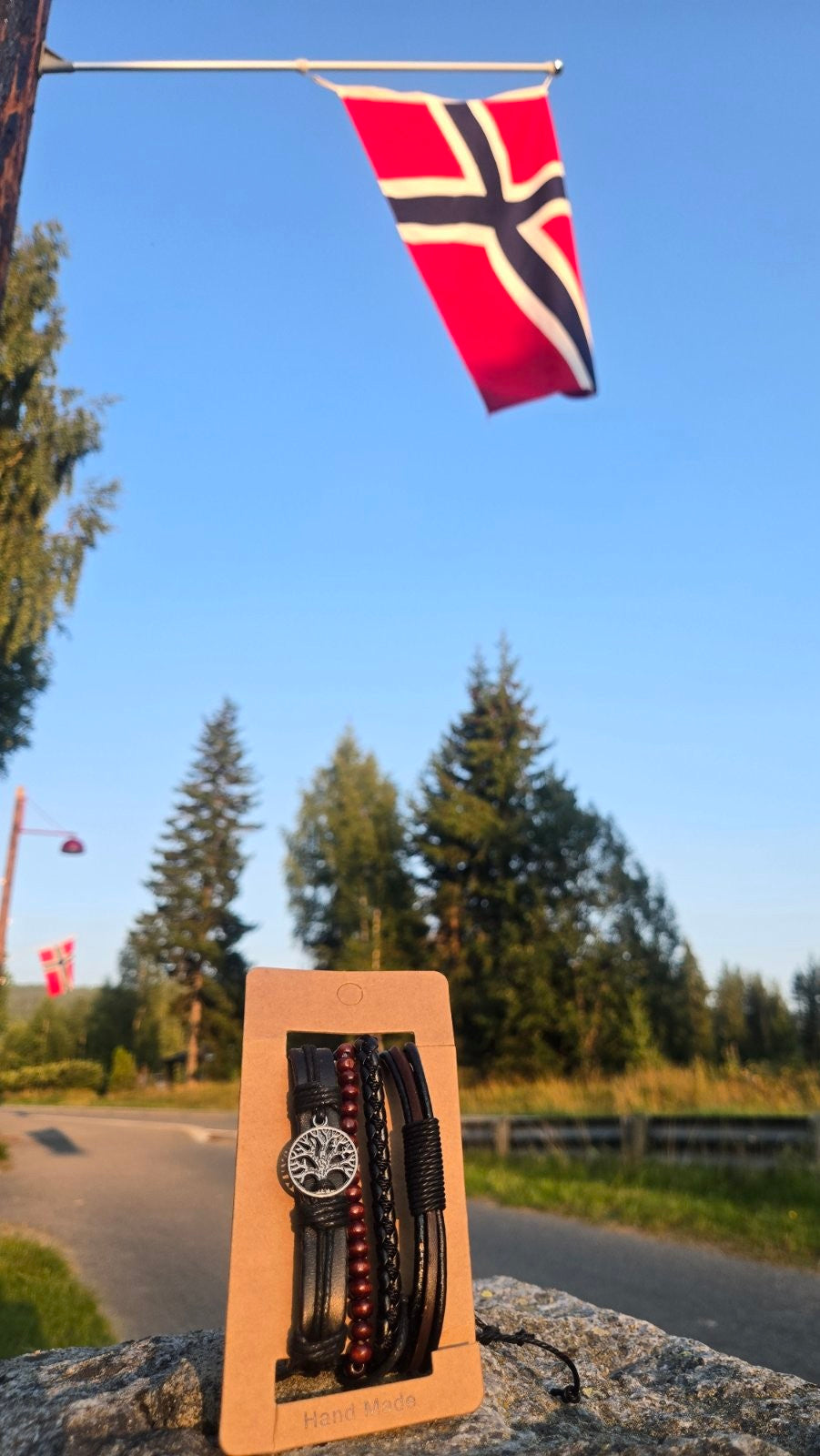 Stilig håndlaget armbånd med unikt design – perfekt for deg som ønsker å kombinere naturlige materialer med personlig stil. Armbåndet består av sorte og mørkebrune skinnremmer, dekorert med små brune perler og et vakkert metallanheng formet som et livets tre. Passer både til hverdag og fest, og gir antrekket ditt et moderne, bohemsk preg. Justerbar størrelse gjør at den passer de fleste håndledd.