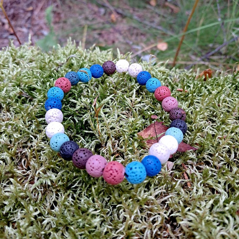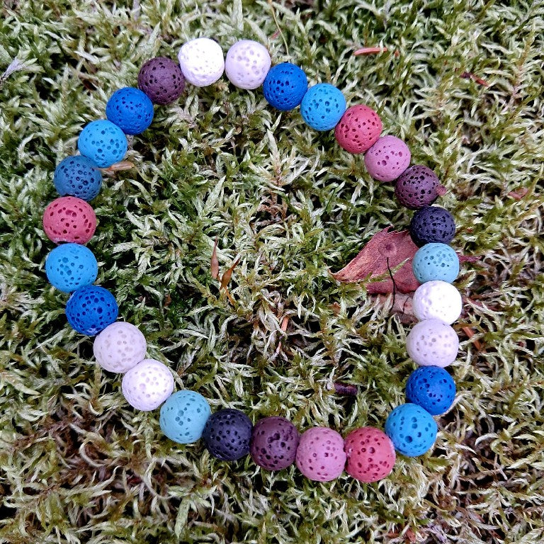 Dette er et armbånd med en lengde på 21cm, laget av vulkanske lavasteinsperler i mange forskjellige farger. Perlene har en karakteristisk porøs og ruglete overflate, noe som er typisk for lavastein. Fargepaletten inkluderer blant annet hvite, rosa, blå, grønne, gule, brune og svarte nyanser, som gir armbåndet et lekent og iøynefallende uttrykk.