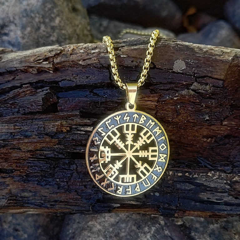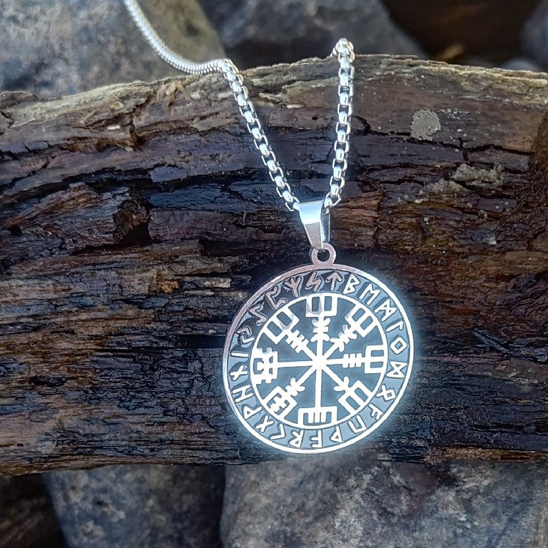 Dette halskjedet med Vegvisir og runer er et moderne smykke med røtter i vikingtidens magi og mystikk.