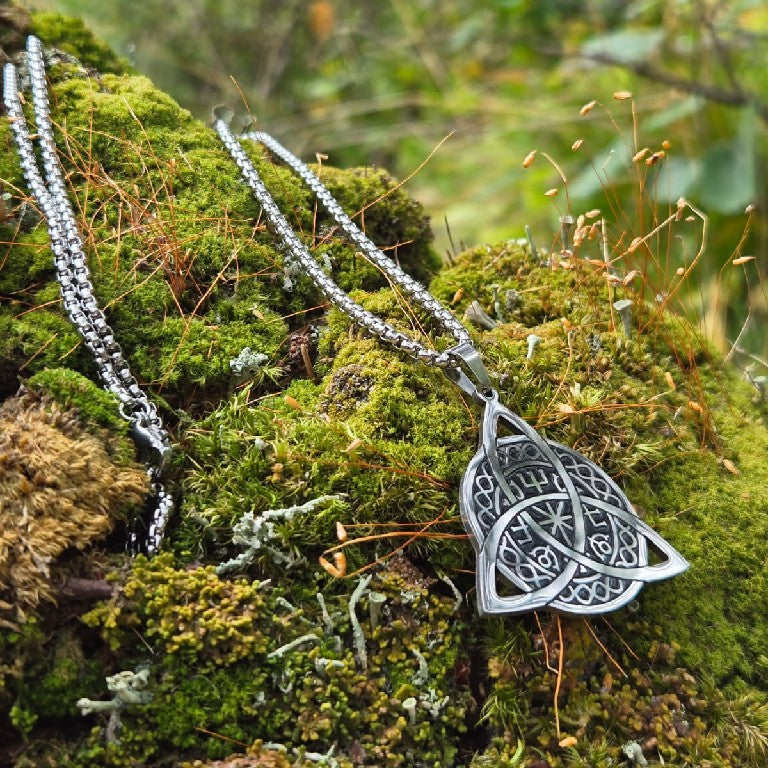 Symbolet – triquetra med runer – står for styrke, beskyttelse og evig liv, og var viktig blant vikingene som tegn på båndet mellom kropp, sjel og ånd.