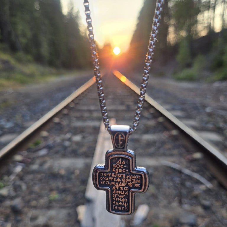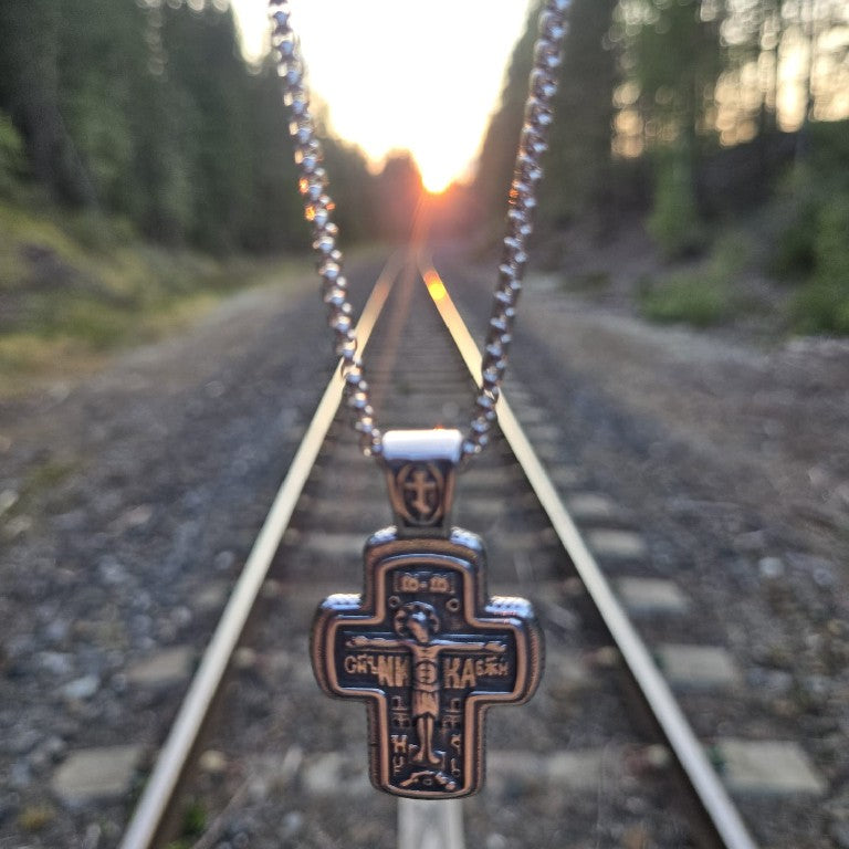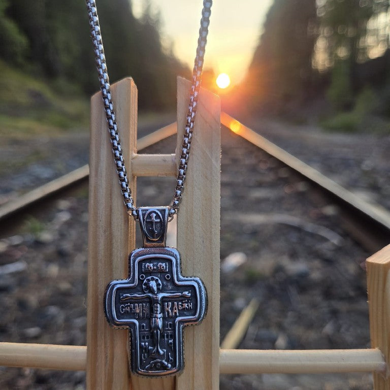 Selger et stilfullt, ortodoks korsanheng med detaljert inngravering på begge sider og med sterke religiøse symboler. Korset er laget i slitesterkt metall og leveres med et solid og elegant kjede på 60 cm. På forsiden av anhenget finnes Kristus-figuren, mens baksiden har tradisjonelle beskyttende inskripsjoner. Perfekt for deg som ønsker å uttrykke din tro, eller gi en meningsfull gave til noen du er glad i.