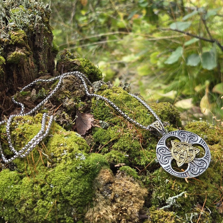 Keltisk anheng med triquetra – et symbol på evighet, balanse og beskyttelse fra keltisk tradisjon. Laget av slitesterk sinklegering med detaljer i gull- og sølvfarge, kjede i rustfritt stål. Et meningsfullt og tidløst smykke for enhver anledning.