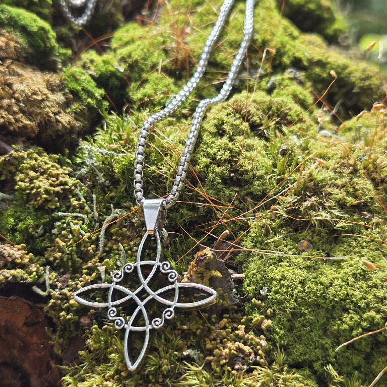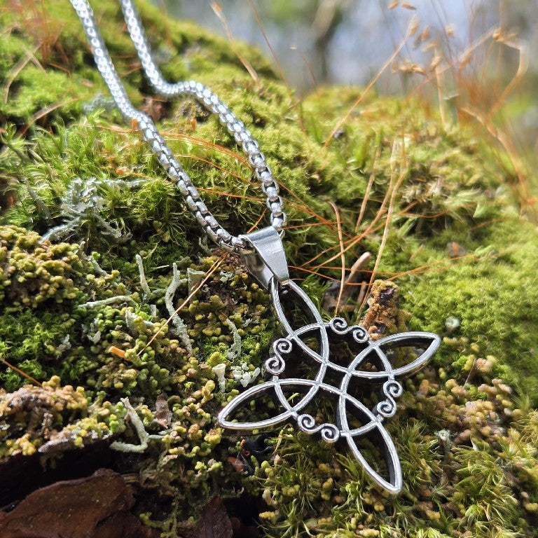 Keltisk anheng med triquetra-symbol – et gammelt symbol på evighet, balanse og beskyttelse, inspirert av keltisk og norrøn kultur. Laget av sinklegering med detaljer i gull- og sølvfarge, kjede i rustfritt stål. Perfekt som meningsfull gave eller til deg selv