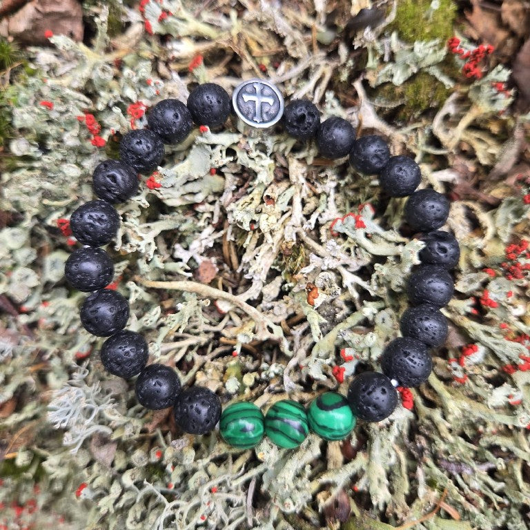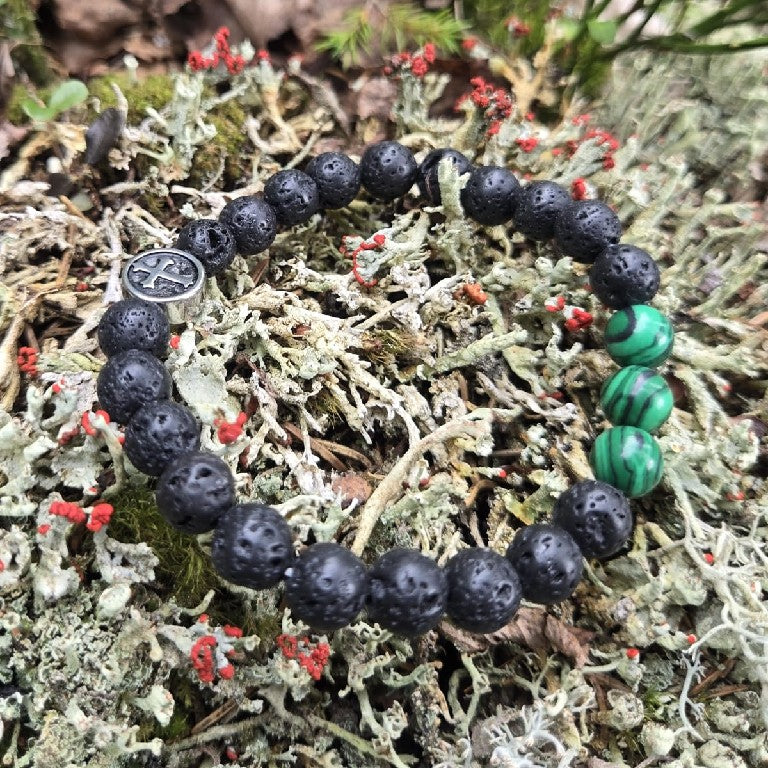 Håndlaget armbånd inspirert av skandinavisk og vikingsk kultur. Laget med autentiske lavasteinperler og malakitt, samt et metall-symbol med vikingkors. Vulkansk lavastein er kjent for sin rå energi og styrke, mens malakitt gir en unik grønn glans og sies å bringe beskyttelse og vekst. Vikingkorset i senteret står for mot, tro og fellesskap – verdier dypt forankret i nordisk historie. Passer både menn og kvinner, elastisk og komfortabelt, perfekt som gave eller til hverdagsbruk for alle som ønsker et kraftfullt og stilfullt tilbehør med historisk betydning.