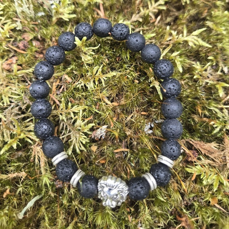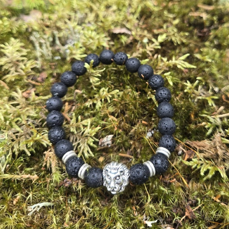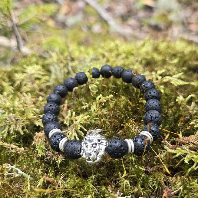 Dette armbåndet er laget av ekte lavastein-perler, kjent for sin rå styrke og naturlige utstråling. Midtpunktet er et kraftfullt løvehode i høykvalitets metall, som symboliserer mot og lederskap – verdier som var viktige i vikingtiden. Hvert armbånd er håndlaget og strukket på slitesterk elastisk tråd, slik at det passer perfekt til de fleste håndledd.