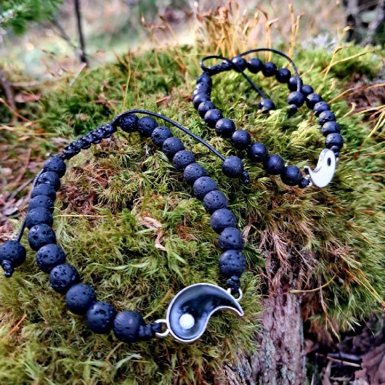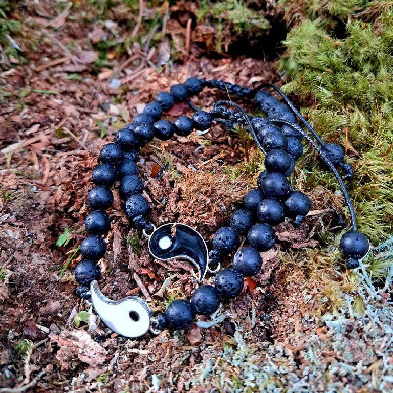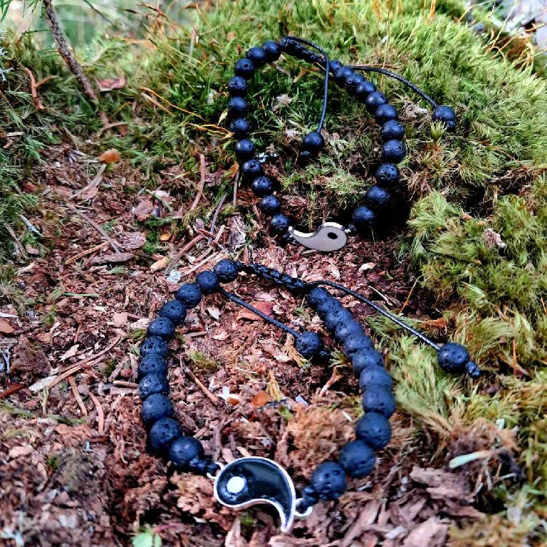 Dette er et sett med to armbånd laget av svarte, runde perler fra lava. Hver armbånd har en Yin-Yang-symbol anheng. Armbåndene er festet med en snor, noe som gjør dem justerbare slik at de passer de fleste håndledd.